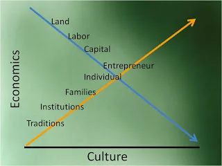 Transformation takes place at the intersection of culture and economics. Where any of the economic components, e.g., land, labor, capital, and the entrepreneur intersect with such components of culture, e.g., traditions, institutions, the family, or individuals, you will probably find transformation taking place. In fact, you can, no doubt, predict that transformation will take place at that intersection. The American farm policy example, between the 1930s and the present, fits the Cultural Economics matrix perfectly: